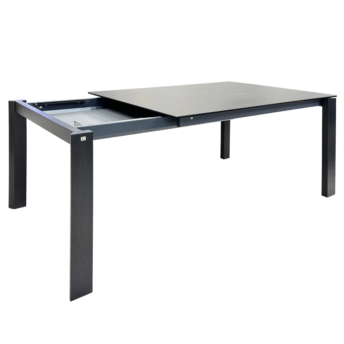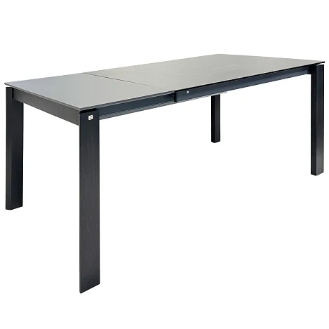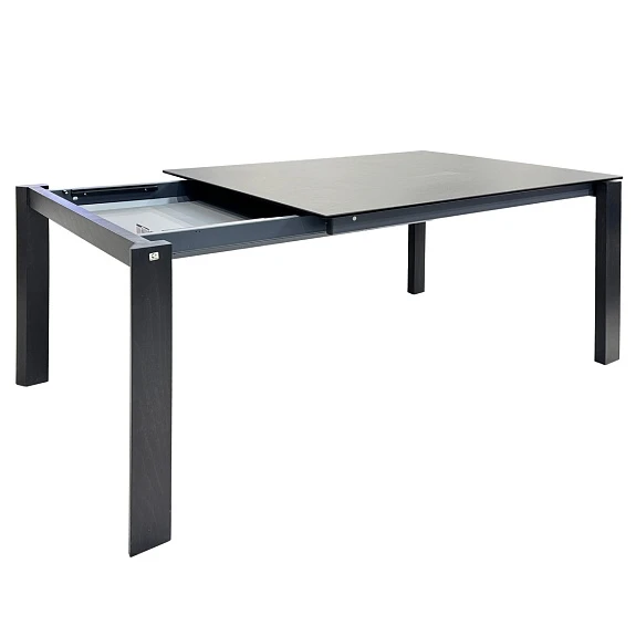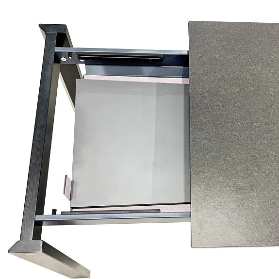 Раскладка стола производится путём удлинения металлической рамы, таким образом, обеспечивается свободная рассадка 6-8 человек (для комфортного раздвижения стола в ножках установлены ролики). Вставка, шириной 50 см, находится внутри стола, вставляется вручную.