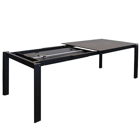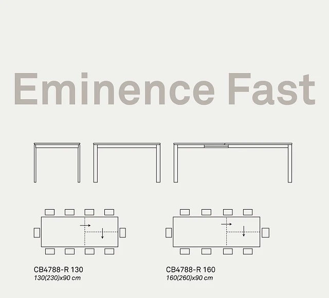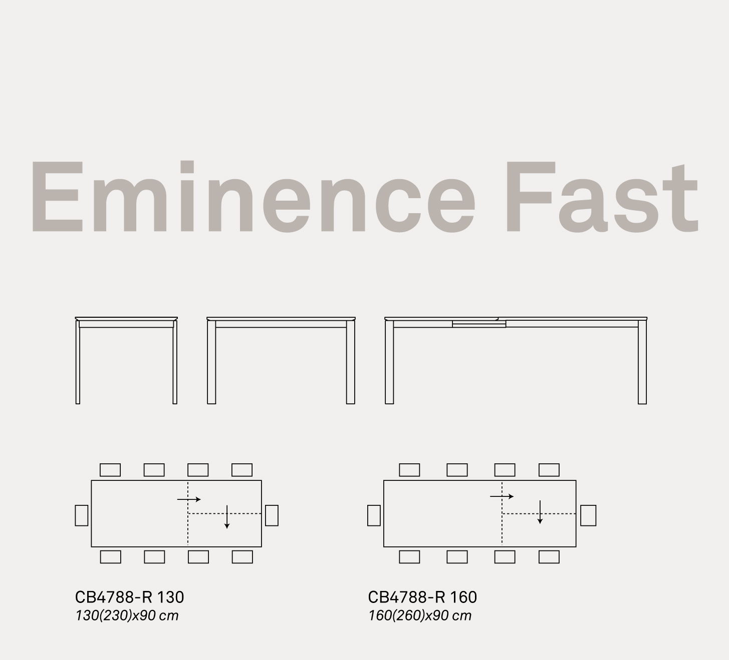 Раскладка Eminence Fast происходит в бок, с помощью вставки-бабочки длиной один метр. Стол раздвигается путём удлинения металлической рамы, таким образом, обеспечивается свободная рассадка 6-10 человек (для комфортного раздвижения стола, в ножках установлены ролики).