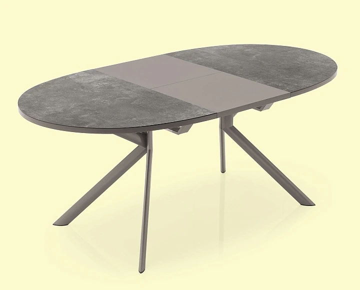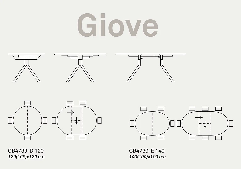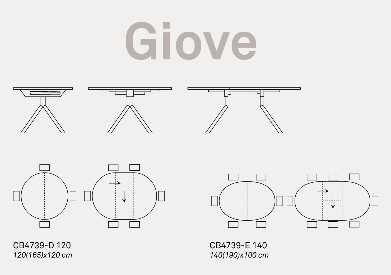 Раскладка GIOVE производится путём растягивания и удлинения рамы вместе с ножками.За столом могут комфортно разместиться 4-8 человек.