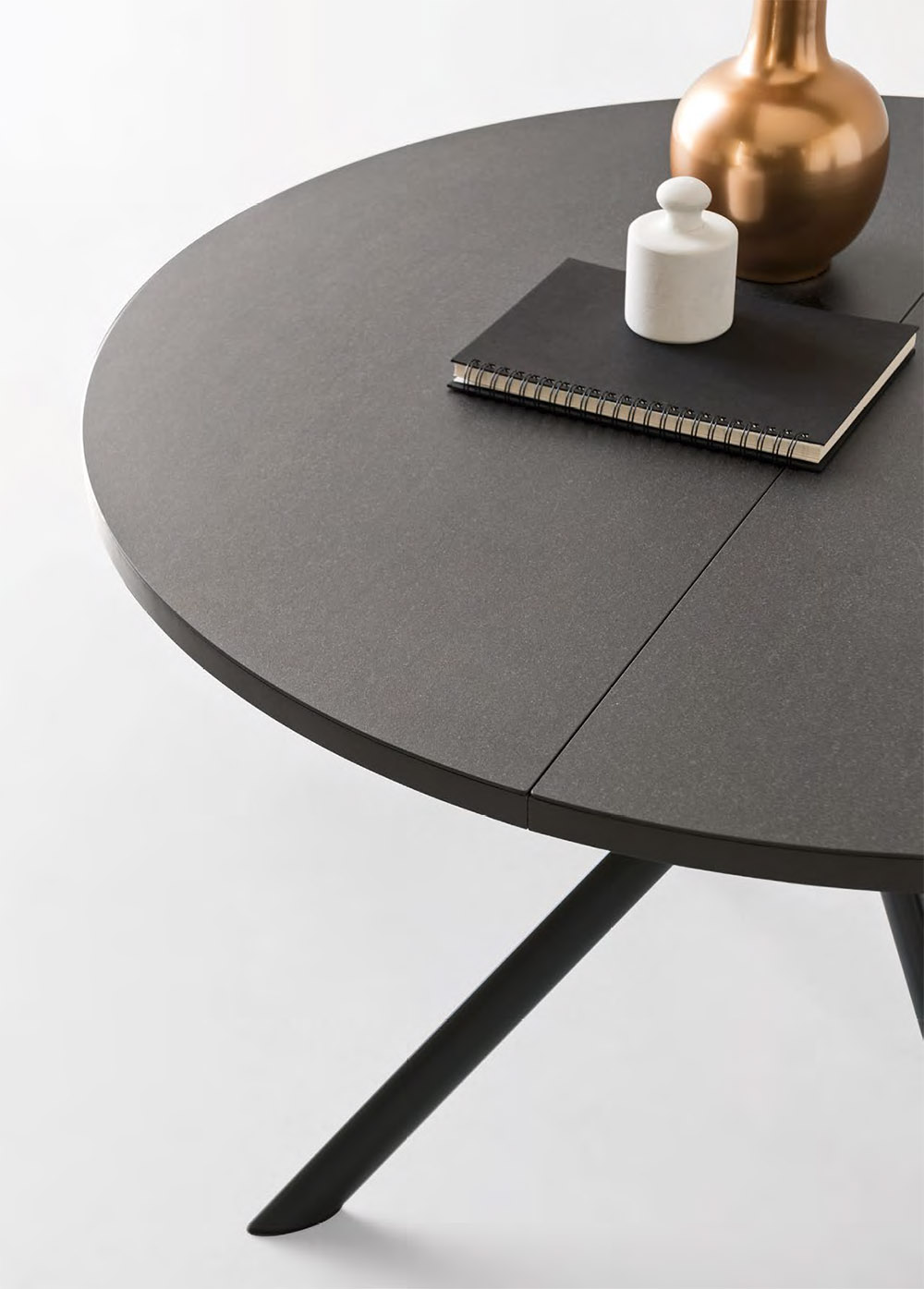 Столешница может быть выполнена из трёх видов материала: ламинат Feelwood, закалённое стекло и стеклокерамика.Вставка-«бабочка», для моделей из стекла и стеклокерамики, выполнена из крашенного, в цвет основания столешницы, МДФ. Вставка для ламинированных столешниц, изготавливается из того же цвета ламината, что позволяет раздвигать стол, без ущерба для эстетики.