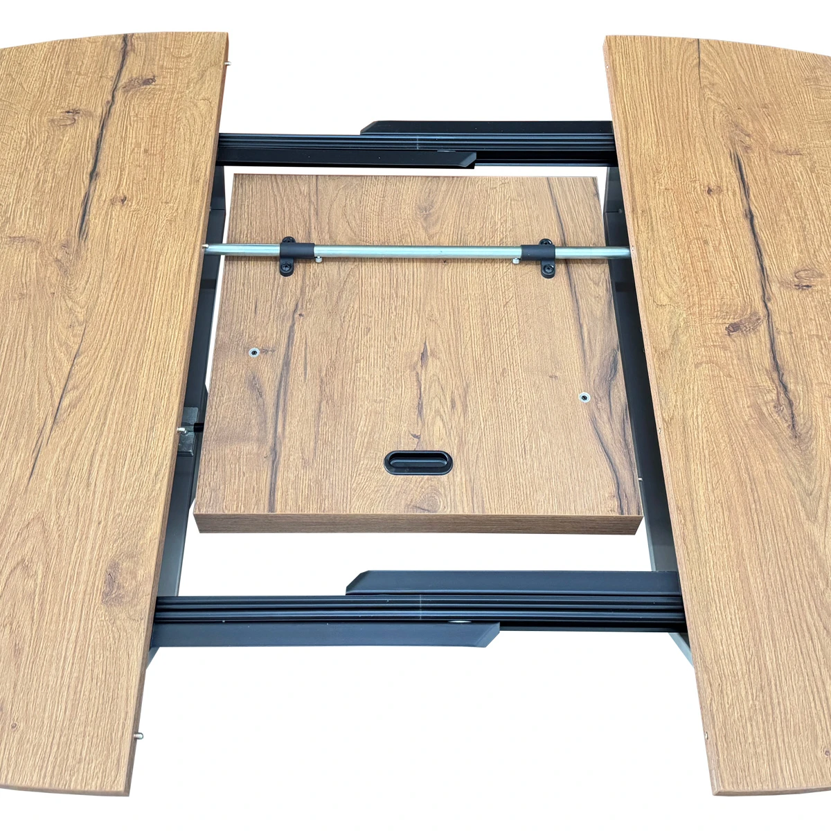 Столешница может быть выполнена из трёх видов материала: ламинат Feelwood, закалённое стекло и стеклокерамика.Вставка-«бабочка», для моделей из стекла и стеклокерамики, выполнена из крашенного, в цвет основания столешницы, МДФ. Вставка для ламинированных столешниц, изготавливается из того же цвета ламината, что позволяет раздвигать стол, без ущерба для эстетики.
