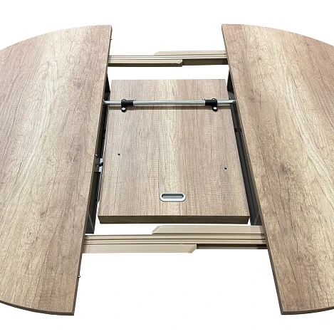Вставка-«бабочка», для моделей из стекла и стеклокерамики, выполнена из крашенного, в цвет основания столешницы, МДФ. Вставка для ламинированных столешниц, изготавливается из того же цвета ламината, что позволяет раздвигать стол, без ущерба для эстетики Раскладка GIOVE производится путём растягивания и удлинения рамы вместе с ножками. За столом могут комфортно разместиться 4-8 человек.