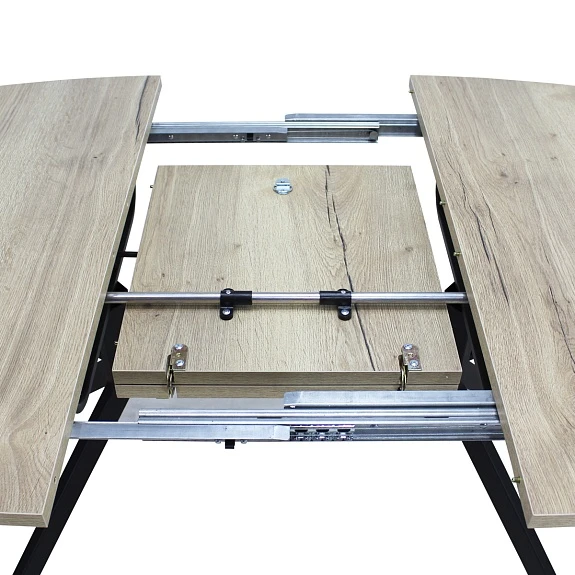 Столешница выполнена из современного ламината австрийского производителя EGGER, который имеет высокие показатели износостойкости и термостойкости. Вставка-«бабочка» исполняется из того же материала, что и основная столешница - это позволяет раздвигать стол без ущерба для эстетики.