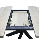 Вставка-«бабочка» исполняется из того же материала, что и основная столешница - это позволяет раздвигать стол без ущерба для эстетики. Раскладка производится путём синхронного раздвижения столешницы.