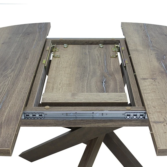 Вставка-«бабочка» исполняется из того же материала, что и основная столешница - это позволяет раздвигать стол без ущерба для эстетики. Раскладка производится путём синхронного раздвижения столешницы.