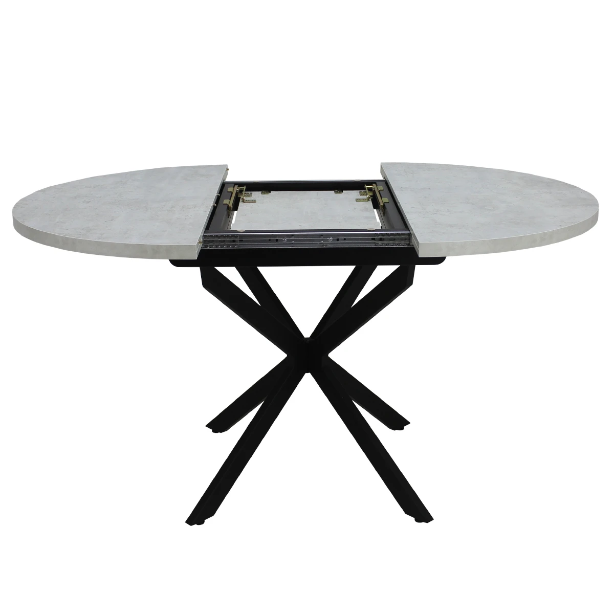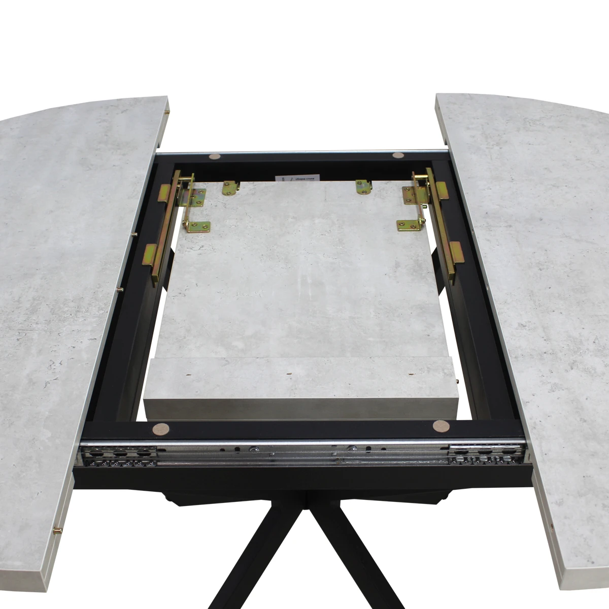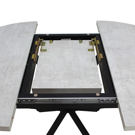 Вставка-«бабочка» исполняется из того же материала, что и основная столешница - это позволяет раздвигать стол без ущерба для эстетики. Раскладка производится путём синхронного раздвижения столешницы.