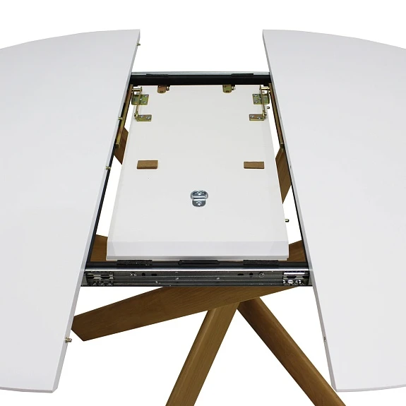 Столешница из МДФ с фактурой дерева.. Вставка-«бабочка» исполняется из того же материала, что и основная столешница - это позволяет раздвигать стол без ущерба для эстетики. Раскладка производится путём раздвижения столешницы.
