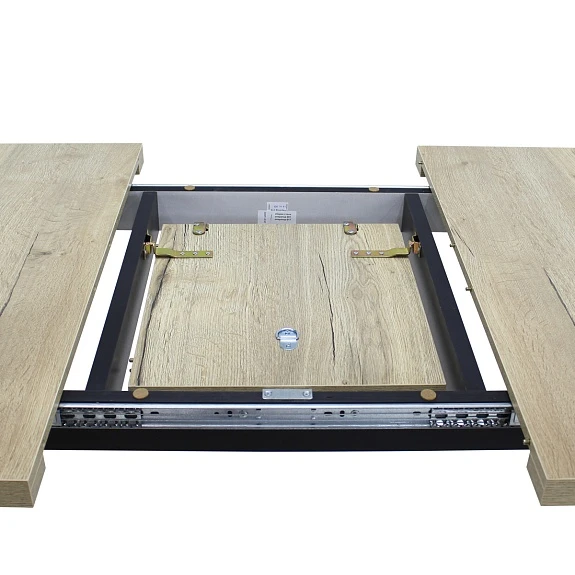 Раскладка производится путём синхронного раздвижения столешницы и, таким образом, обеспечивается свободная рассадка 6-10 человек.