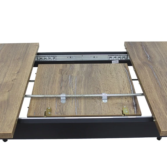 Вставка-«бабочка» исполняется из того же материала, что и основная столешница - это позволяет раздвигать стол без ущерба для эстетики. Раскладка производится путём синхронного раздвижения столешницы и, таким образом, обеспечивается свободная рассадка 4-8 человек.