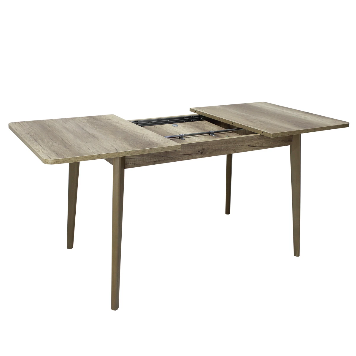 Вставка-«бабочка» исполняется из того же материала, что и основная столешница - это позволяет раздвигать стол без ущерба для эстетики. Раскладка производится путём синхронного раздвижения столешницы и, таким образом, обеспечивается свободная рассадка 4-8 человек.