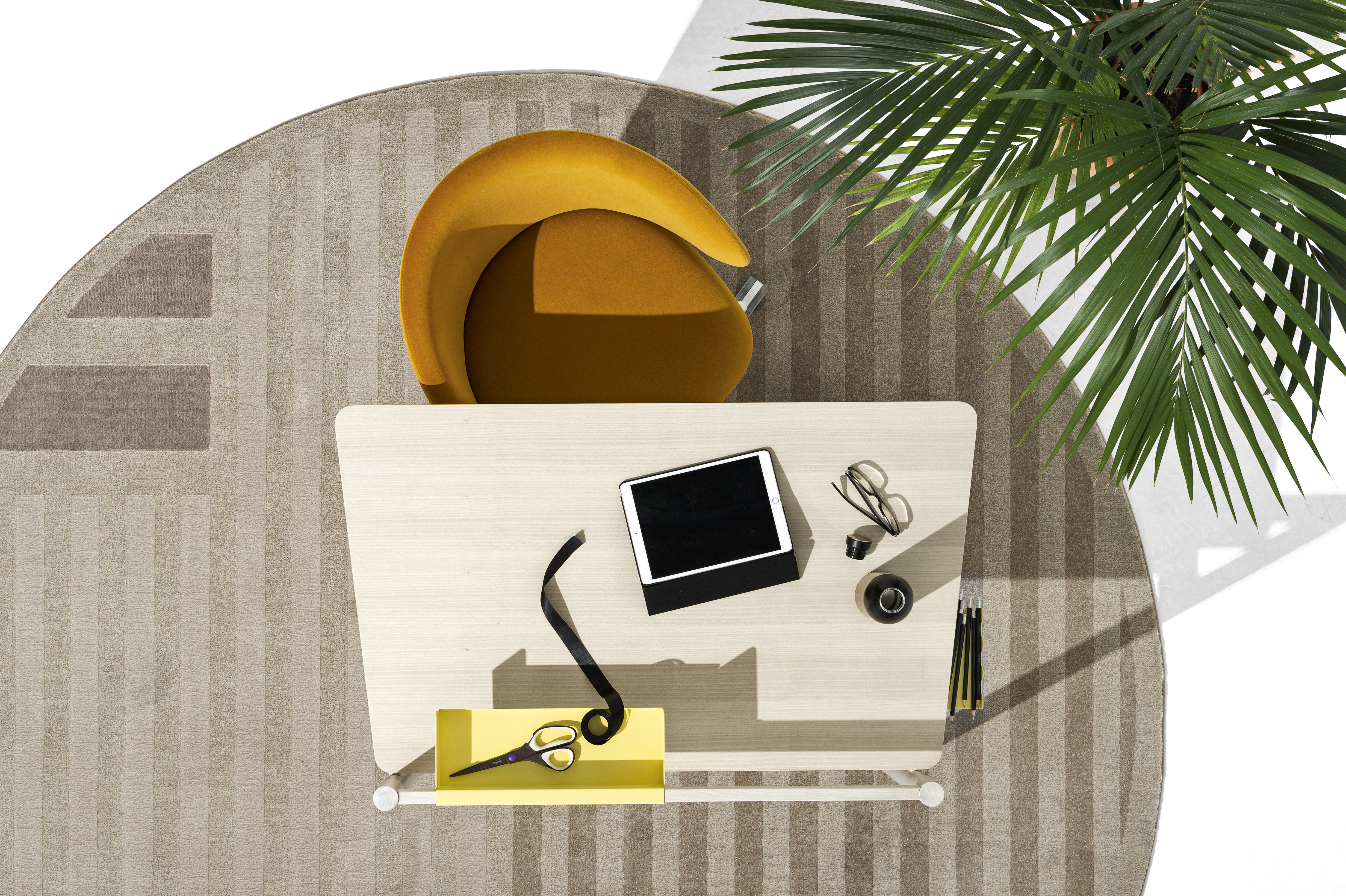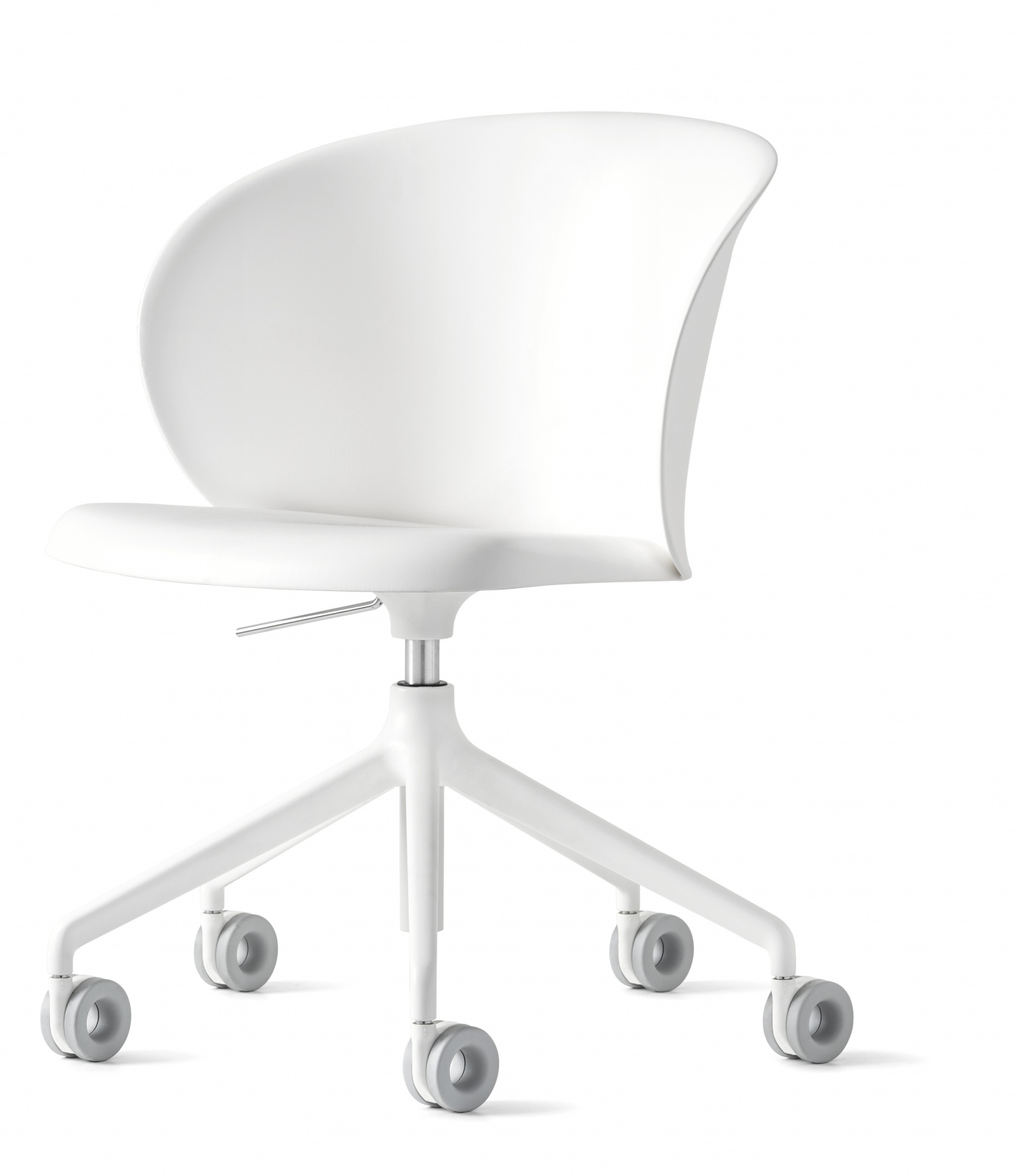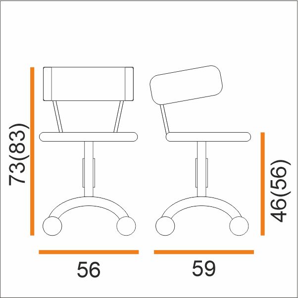 Обивка сиденья и спинки выполнены из современных материалов. Корпус на поворотной центральной опоре из литого алюминия, снабженной системой газлифта, что позволяет регулировать высоту. В основании имеются колёсики.