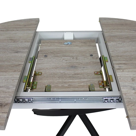 Столешница, толщиной 25 мм, выполнена из современного ламината австрийского производителя EGGER, который имеет высокие показатели износостойкости и термостойкости. Вставка-«бабочка» исполняется из того же материала, что и основная столешница - это позволяет раздвигать стол без ущерба для эстетики.