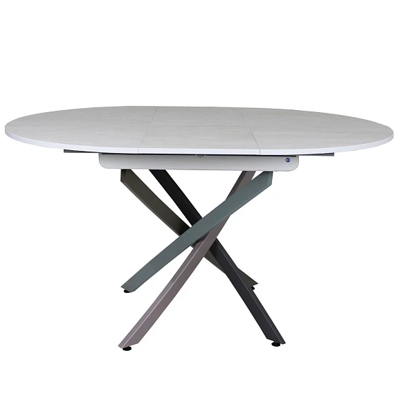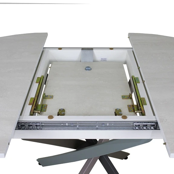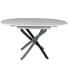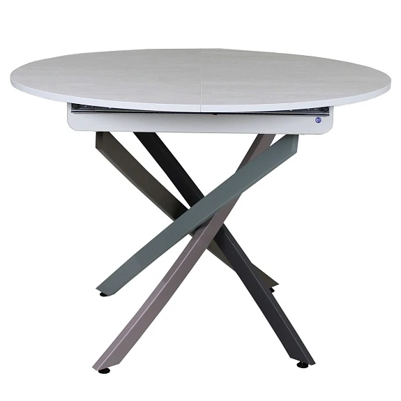Круглый стол, в стиле Контемпорари, на металлической основе. Столешница выполнена из современного ламината австрийского производителя EGGER, который имеет высокие показатели износостойкости и термостойкости. Вставка-«бабочка» исполняется из того же материала, что и основная столешница - это позволяет раздвигать стол без ущерба для эстетики.Раскладка производится путём синхронного раздвижения столешницы.
