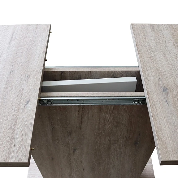 Стол изготавливается из современного износостойкого ламината. Раскладка производится путём синхронного раздвижения столешницы. Вставка, в цвет декоративных вставок на опоре, хранится внутри стола.