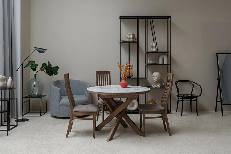 Свободное место между планками, их четкие линии и при этом слегка изогнутые ножки добавляют изделию особой элегантности. А обтянутое тканью сиденье не просто удобное, но и станет органичным акцентом в пространстве кухни, гостиной, столовой. Такой стул идеально дополнит интерьер в стиле современного модернизма.